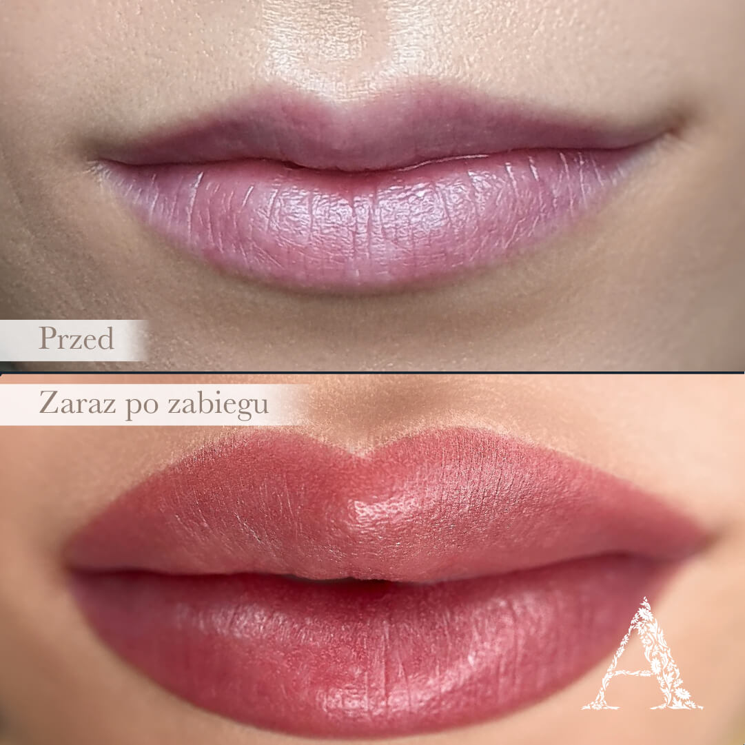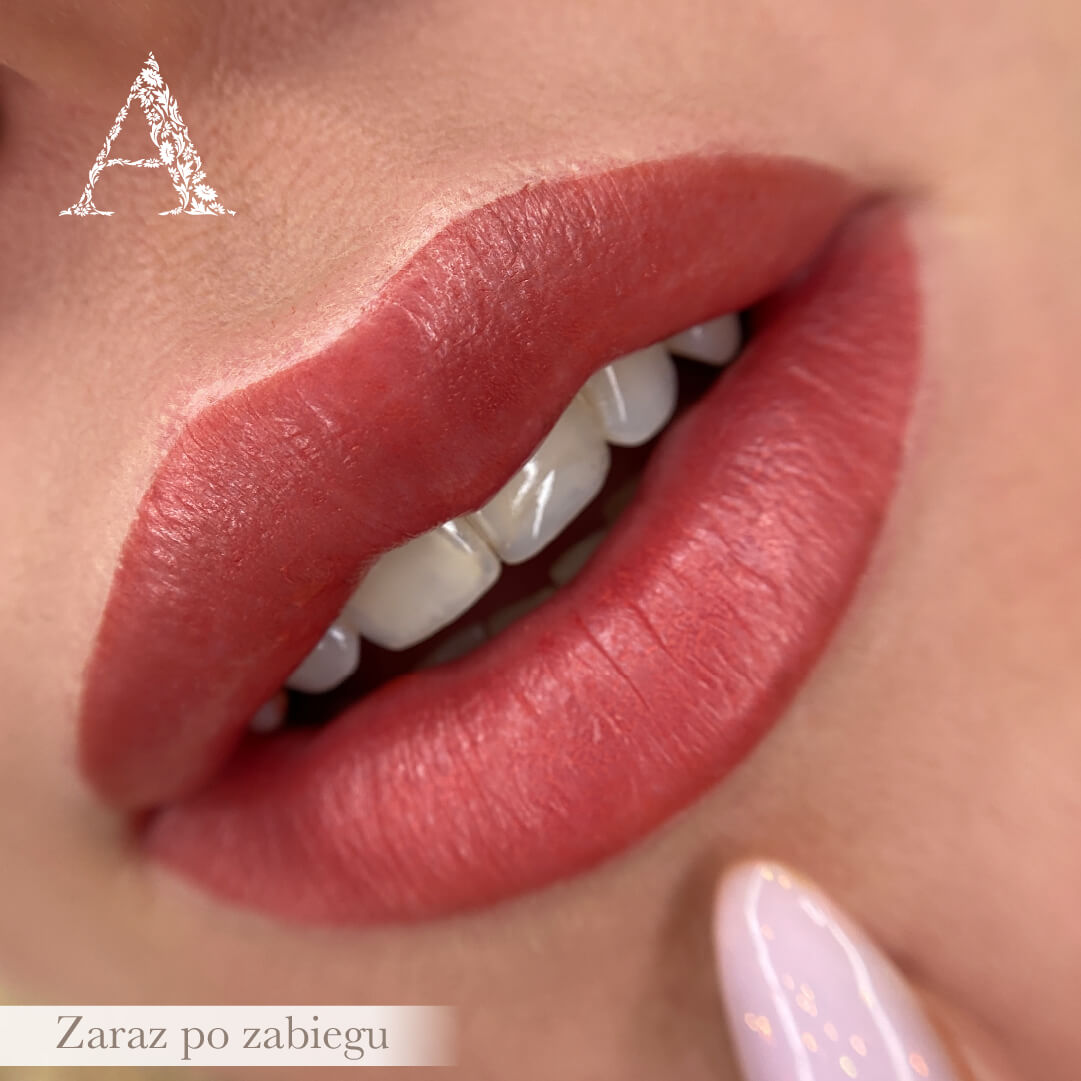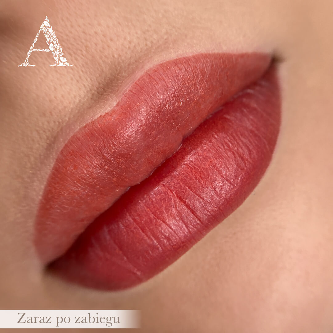 Zerknijcie na ten świeżo wykonany makijaż permanentny ust! 😍 Bezpośrednio po zabiegu kolor jest intensywny, ale nie dajcie się zmylić. Po pełnym procesie gojenia, kolor staje się delikatny i naturalny, idealnie dopasowując się do Twojej urody.