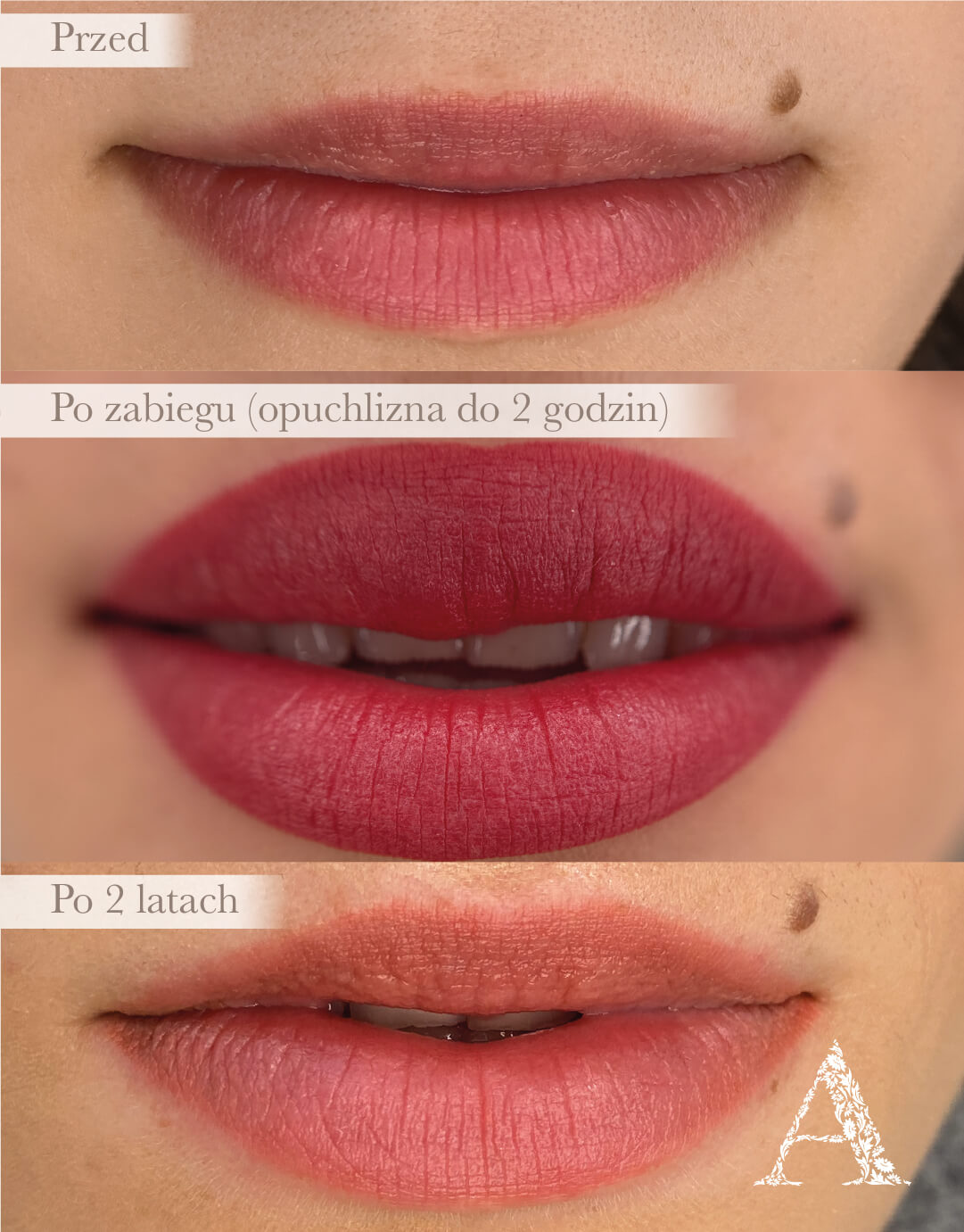 Twoje usta przez lata wyglądają świeżo i naturalnie — delikatnie podkreślone, miękkie i pełne życia. Kolor stopniowo traci intensywność, ale kształt i harmonia pozostają niezmienne, tworząc piękny, subtelny efekt.